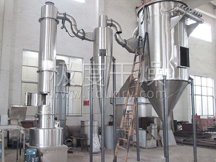 热空气切线进入干燥器底部,在搅拌器带动下形成强有力的旋转风场。膏状物料由螺旋加料器进入干燥器内,在高速旋转搅拌桨的强烈作用下,物料受撞击、磨擦及剪切力的作用下得到分散,块状物料迅速粉碎,与热空气充分接触、受热、干燥。脱水后的干物料随热气流上升,分级环将大颗粒截留,小颗粒从环中心排出干燥器外,由旋风分离器和除尘器回收,未干透或大块物料受离心力作用甩向器壁,重新落到底部被粉碎干燥。